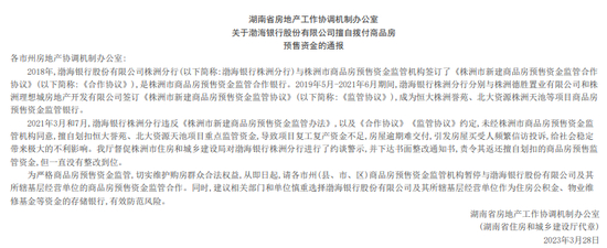 3月28日,湖南省住房和城乡建设厅(简称:湖南住建厅)官网,公开发布了这份《关于渤海银行股份有限公司擅自拨付商品房预售资金的通报》。