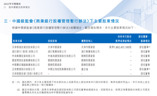 渤海银行在2022年上半年报中披露,公司“无控股股东、实控人”。不过,持股20.34%的第一大股东泰达控股,为天津国资背景。渤海银行披露,按照银保监口径,泰达控股及其关联方授信净额为125.78亿元,这一数值与按照香港联交所口径统计一致。