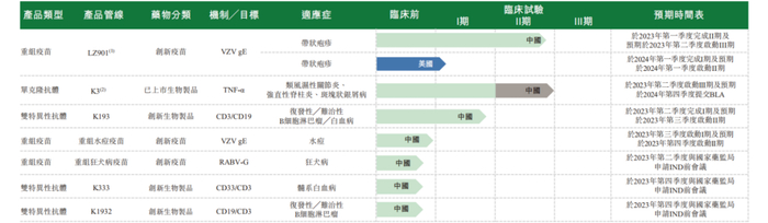 目前,LZ901在中国已启动II期临床试验,预计于2023年第二季度启动主动对照III期临床试验以将LZ901与Shingrix®进行比较,并于2024年第三季度向国家药监局提交LZ901的生物制品许可申请(BLA)。