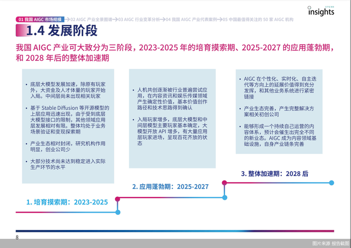 从当下到2030年,报告将我国AIGC产业发展划分为三个阶段,分别为培育摸索期(2023-2025年)、应用蓬勃期(2025-2027年)以及整体加速期(2028-2030年)。