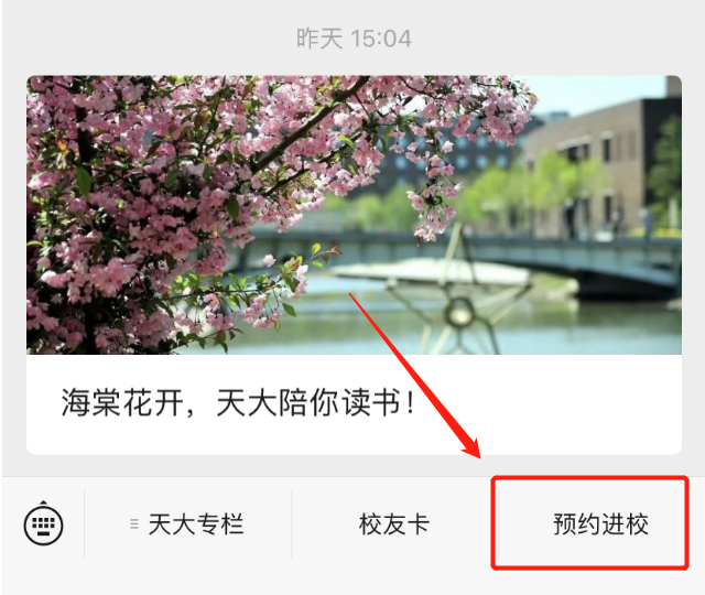 市民游客可关注“天津大学”微信公众号,在底部菜单栏点击“预约进校”,进入“天大·海棠季”入校预约系统,提交个人身份信息,该系统可选择日期为3 月31日至4月6日,为了便于更好赏花,市民可在7天中选择1天申请入校,在校门处接受核验,出示预约二维码