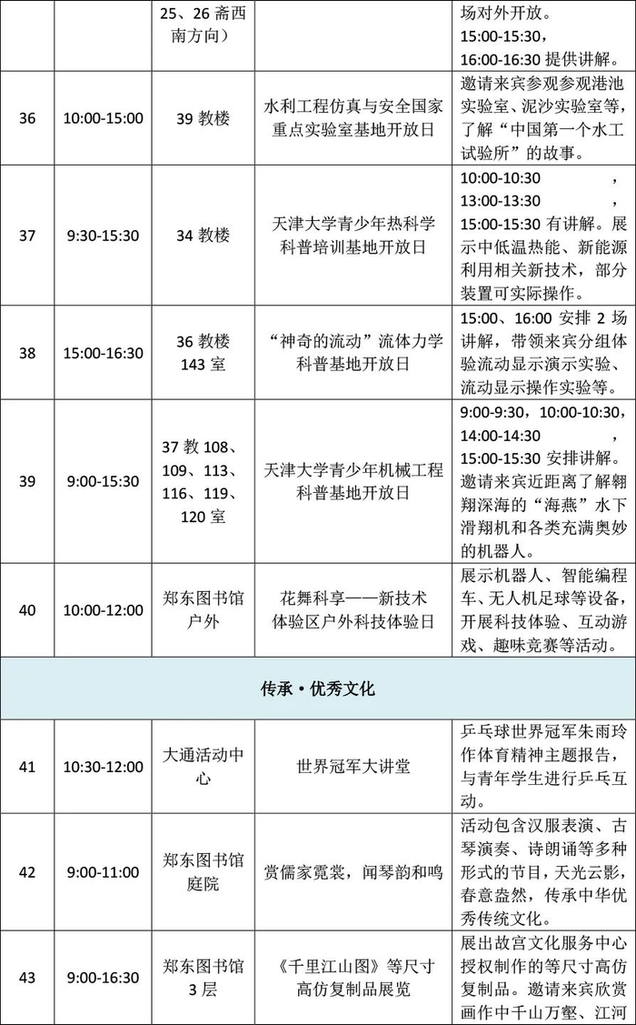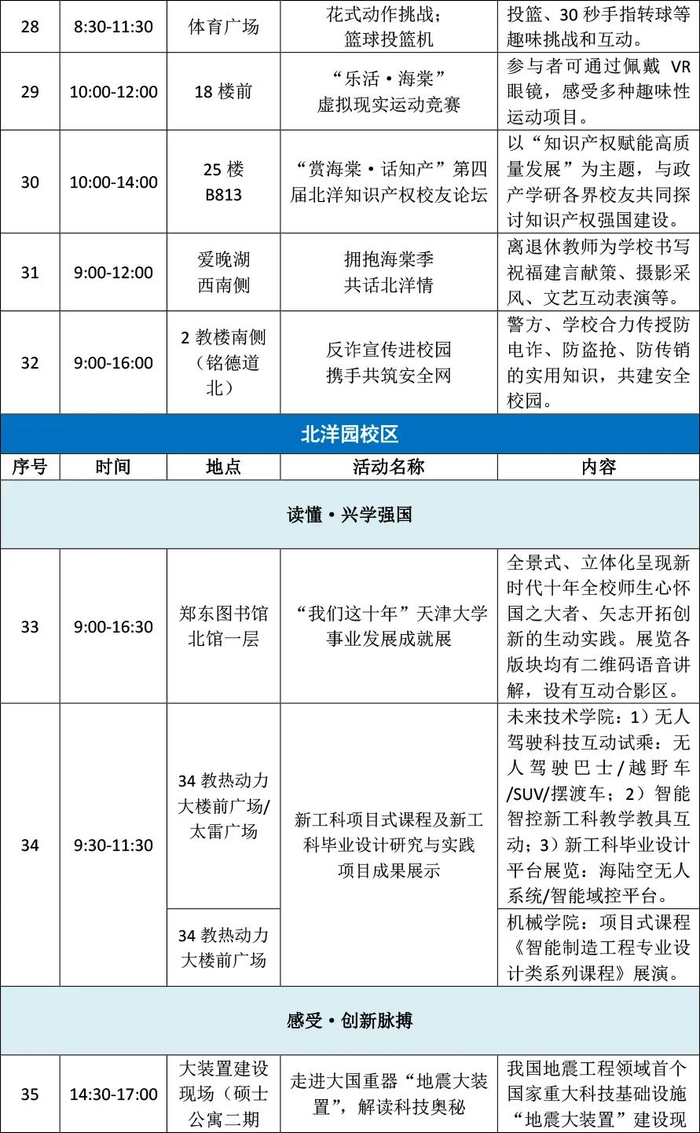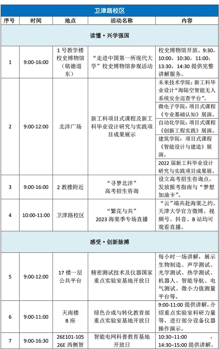 开放日当天,在天津大学卫津路校区和北洋园校区各有“读懂·兴学强国”“感受·创新脉搏”“传承·优秀文化”“邂逅·北洋之春”4条主题游览线路。届时将举办“走进中国第一所现代大学”校史博物馆参观活动、新工科项目式课程及毕业设计成果展演、走进大国重器“地震大装置”、国家/教育部重点实验室开放、冯骥才文学艺术研究院“学院开放日”、乒乓球世界冠军大讲堂、中外师生文艺汇演等形式多样的活动。(详见文末活动一览表)