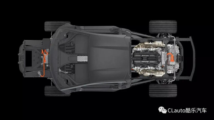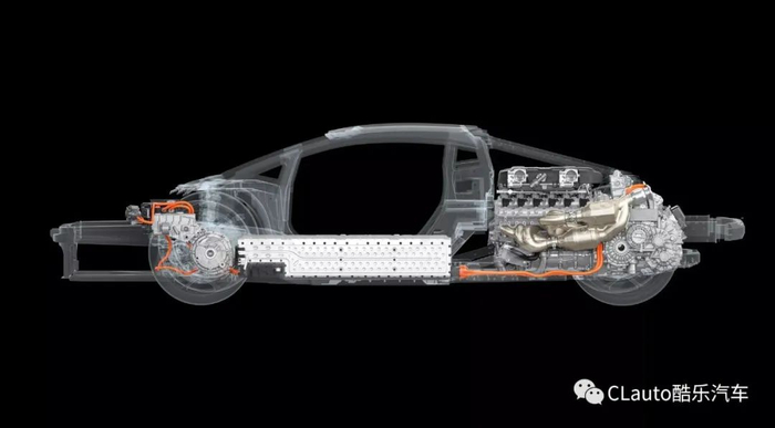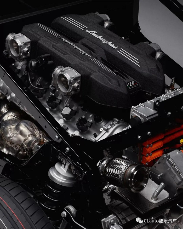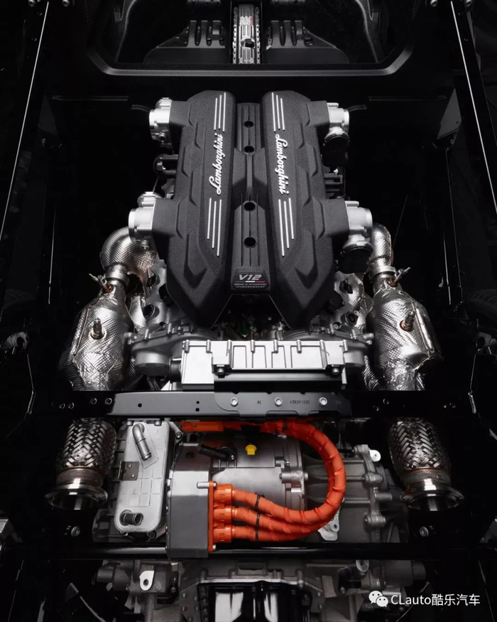这台兰博基尼的V12车型首次安装双离合器变速箱,除了安装新开发的6.5升自然吸气V12发动机外,另外还搭载3个电机。其中2个电机被整合为新的8档双离合器变速器,首次横向放置在发动机后方。在车辆中部原先安装变速箱的地方,安装了锂离子电池。