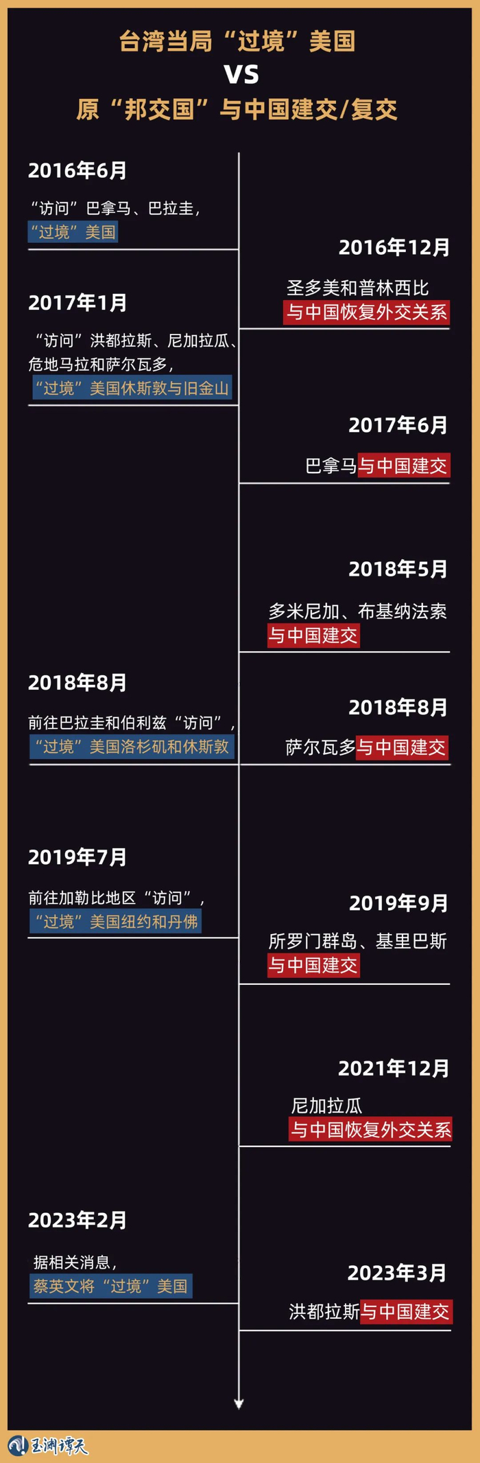 事实上,类似的情况已经不是第一次发生了。把台湾当局“过境”美国和“断交”的时间线结合起来,能够看出明显的规律:“过境”美国的同时,台湾当局的“邦交国”,也在越访越少: