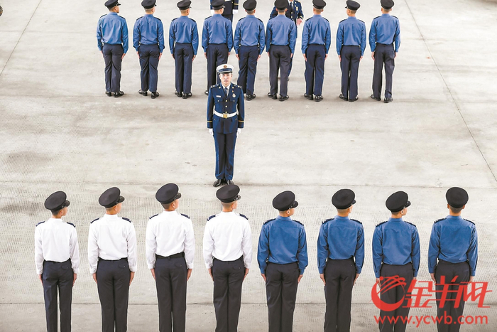 羊城晚报讯 记者郭思琦摄影报道:“稍息、立正、向右看齐……”29日一早,在国家陆地搜寻与救护基地(广东)内,来穗参加国情研习的香港消防处消防及救护学院的学员们开始了第二天的训练。训练项目是学员们最期待的培训内容之一:中式队列步操训练。