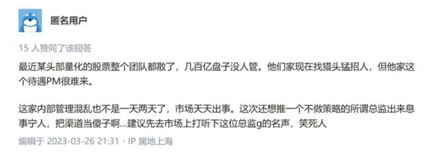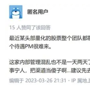 3月26日晚间,有匿名用户在知乎平台上发布一则帖子,称某头部量化私募的股票团队散了,正在找猎头猛招人。渠道人士消息称,相关消息共涉及3家百亿量化私募,包括天演资本的策略总监和相关核心团队、白鹭资管的投资经理(PM)和千象资产的PM。