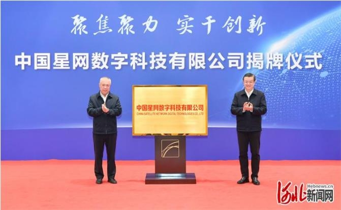 3月29日,省委书记、省人大常委会主任倪岳峰与中国卫星网络集团有限公司党组书记、董事长张冬辰共同为中国星网数字科技有限公司揭牌。 记者赵海江摄