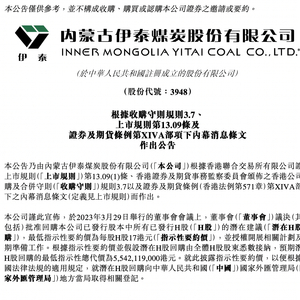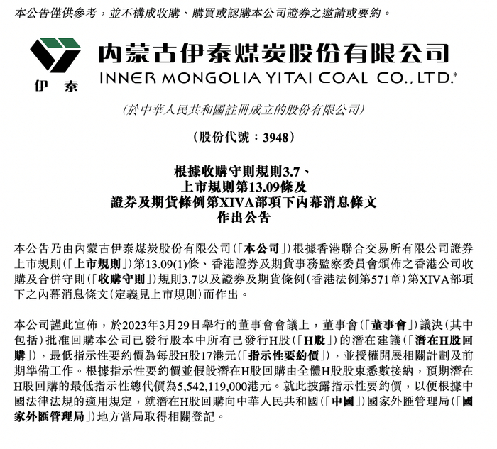 2023年3月29日举行的董事会会议上,伊泰煤矿议决批准回购所有已发行港股股份,最低指示性要约价为每股17港元,预期潜在回购的最低总代价为55.42亿港元。