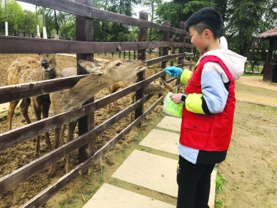 小记者在松鼠部落森林假日公园喂食小鹿。