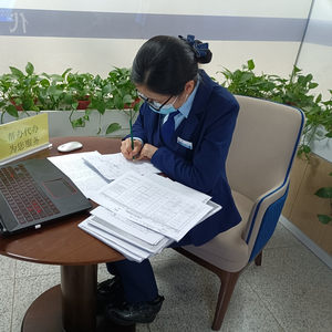 图为代办员正在整理企业报建资料。