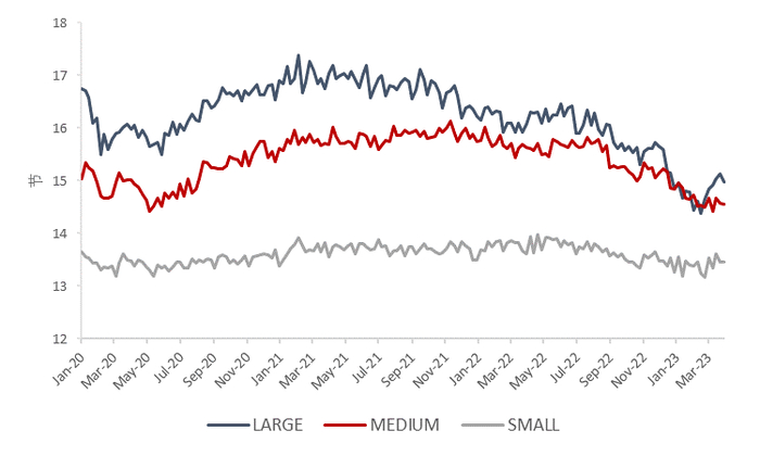 进入2023年后,整个集装箱航运市场一直处在需求疲软、运力过剩的供过于求的基本面之中。在2020-2021年历史级行情的影响之下,各大航运公司可谓是赚的盆满钵满,充足的现金流开启了其从2020年12月开始集中造船和造集装箱的热潮:目前集装箱船手持订单占全球运力的比例已经突破了30%的高位(图3),集装箱的制造量也同样出现了过剩的情况(图4),这直接导致了大量的空箱在全球的供应链条中进行运转。面对由供不应求急速变化为供过于求的市场,叠加上环保政策和低运价(引发了价格战)的双重压力,各大航运公司不得不采取了降低船速(限制主机功率等)、精简货物载重、对现有船舶进行节能减排改造(船舶清洗以减少航行阻力、安装脱硫塔、加装船帆等)等“低成本”的方式来压缩运力:通过图5我们可以看到目前的集装箱船正以历史最低速度水平在海上航行,并且3月的闲置船队占总船队的比例达到了将近5.5%的高位(图6),这是自去年8月以来的最高水平。另一方面,“财大气粗”的航运巨头正在为未来做着更长远的规划:面对环保政策他们采取了订购以甲醇或者LNG为清洁能源的船和拆除老旧高碳排放船舶的“高成本”方式——有巨头为整个行业做引路人,以订造清洁能源为主的新船舶以及拆解老旧船舶将在航运业掀起新周期的浪潮。总之,环保减碳政策在整个航运业的严格推行定会是新的趋势的起点,是大势所趋,机遇将一直与风险并存。