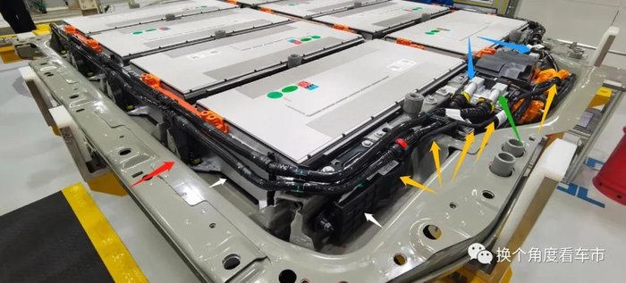 黄色箭头:动力电池内部左右的电芯模组应对2组冷却液管路