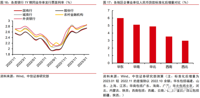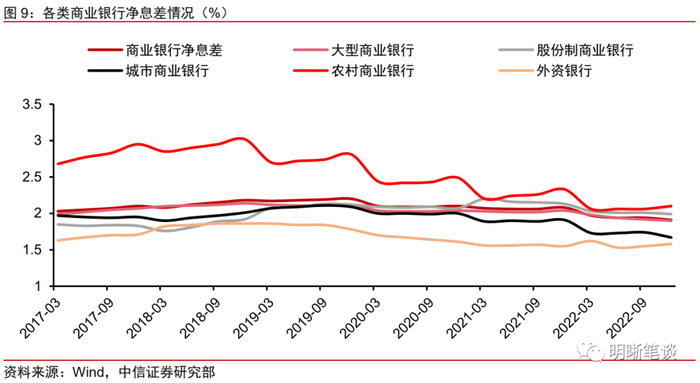 大行同业存单发行利率历史分位数较高和信贷需求的区域分化也可侧面佐证大型银行和中小型银行的信贷投放分化。2022年11月以来,各类银行1Y期同业存单发行利率均快速上行并维持高位至今。分银行类型看,国有行、股份行、城商行、农商行、外资行2022年11月至2023年3月前20日的同业存单票面利率均值所处2018年以来历史分位数分别是27.1%、27.2%、25.4%、26.7%和26.2%,国有行和股份行同业存单发行利率历史分位数高于城农商行和外资行。此外,去年底以来地区间信贷需求增量的分化同样表明过去一段时间的信贷增量投放主要集中于大行易于触及的东南沿海地区(样本包括福建、山东、上海、江苏、广东、海南、广西等华东和华南地区)。综上,去年11月以来的增量信贷投放以国有大行为主体,主要投放区域又集中于东南沿海地区,这或许意味着中小行的信贷投放相对受阻,资产端收益受损幅度较大行更为显著。拉长周期看,农商行的净息差压降幅度同属(图9)银行类金融机构首位,从而有更直接的动机增配债券以缓解业绩压力。叠加农商行本身信用债配置比例和债券投资灵活性即高于国有大行,直接增持信用债的阻碍相对较小。