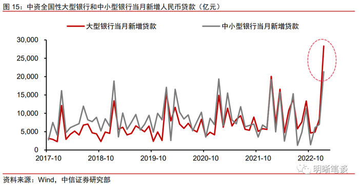 由于优质信贷资源有限,农商行与大行存在较大差距,存在大行和小行之间信贷投放分化不断加剧的情况,因此小行选择增配债券提高整体收益。一方面,“宽信用”期间大行更低的贷款利率对农商行贷款业务形成分流,导致后者信贷投放量偏低,资产端收益率受损幅度更大。另一方面,农商行的负债端成本显著高于大行,整体净息差恶化幅度更大。农商行信贷投放受阻和净息差压力为债券投资提供余量资金基础和配置动机。若直接观察中资全国性大型银行和中小型银行当月新增人民币贷款情况,与过去中小行贷款投放高于或持平于大行的情况不同,2023年1月大行新增贷款显著超出中小行,大行信贷投放对中小行形成挤出。