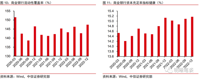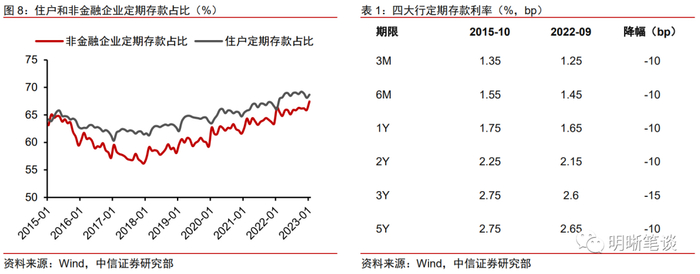 另一方面,随着居民存款累积和存款定期化程度加深,商业银行负债端成本无明显压降甚至有所上升,整体净息差收窄压力加大。由于疫情期间居民的消费、投资和信贷需求受到抑制,居民对住房、金融市场和经济形势的预期较弱,从而形成被动和主动超额储蓄并导致住户存款高增。央行数据显示,2022年住户存款新增17.84万亿元,同比多增7.94万亿;2023年1-2月,住户存款合计新增近7万亿,同比多增1.88万亿。2022年12月央行的城镇储户问卷调查数据也显示,更多储蓄占比延续抬升至61.8%,而更多消费和更多投资占比则分别持平22.8%和下滑至15.5%,消费场景打开后,居民储蓄意愿依然较强。存款利率市场化改革虽然稳步推进,但未能弥补定期化程度加深带来的存款成本抬升压力,银行净息差压力有所加大。