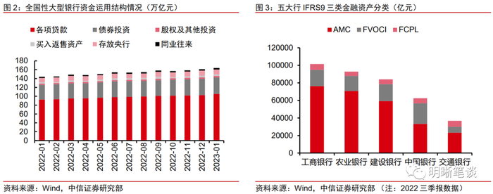 债券资产占据商业银行金融资产投资的绝大部分,以AMC和FVOCI配置型资产为主,二者合计占比在90%以上。根据IFRS9的新会计准则,商业银行的金融资产中除长期股权资产外,债务工具和权益金融资产需按现金流的产生方式划分为AMC(以摊余成本计量)、FVPL(以公允价值计量且其变动计入当期损益)和FVOCI(以公允价值计量且变动计入其他综合收益)三类。AMC类资产仅以收取本息为持有目的而持有至到期,通常被纳入配置账户;而FVOCI虽然可以即时计入价值变动,持有目的既包括收取本息也用于出售,但其交易频率较低且配置策略变动有限,因此也被归入配置账户中;FVPL类资产可随时买入卖出且资本利得即时计提,被纳入交易账户。根据其2022年三季报,五大行所持有的金融资产中,AMC和FVOCI配置型资产占比均在90%以上。