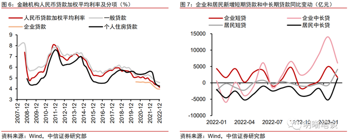 去年以来商业银行放贷利率下降而信贷投放增量,资产端收益整体下滑。从价上看,由于房地产市场持续低迷,为刺激按揭贷款需求并为经济修复提供宽松的货币条件,5年期LPR分别于去年5月和8月超预期下调15bp至3.65%,当前金融机构一般贷款、企业贷款和个人住房贷款加权平均利率分别处于4.57%、3.97%和4.26%的历史低位,银行资产端放贷收益率下降。从量上看,在“稳增长”政策指导下信贷持续向好,企业中长期贷款延续高增,居民短期贷款也于今年初大幅抬升,或因居民“借短还长”动机所致;票据利率维持高位也可佐证信贷“开门红”,意味着商业银行放出大量低成本贷款,资产端收益整体下台阶。