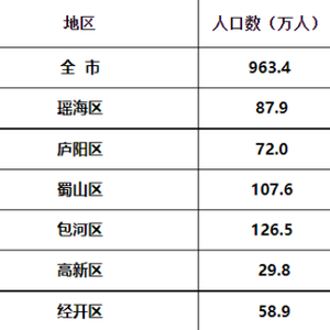 在全市县区人口分布中,常住人口超过百万的为包河区和蜀山区,分别为126.5万和107.6万。