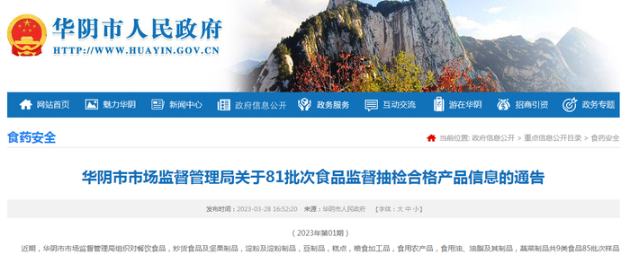陕西省华阴市市场监管局公示81批次食品监督抽检合格信息