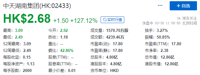截至午间收市,中天湖南集团每股报2.68港元,大涨127.12%,总市值为12.86亿港元。