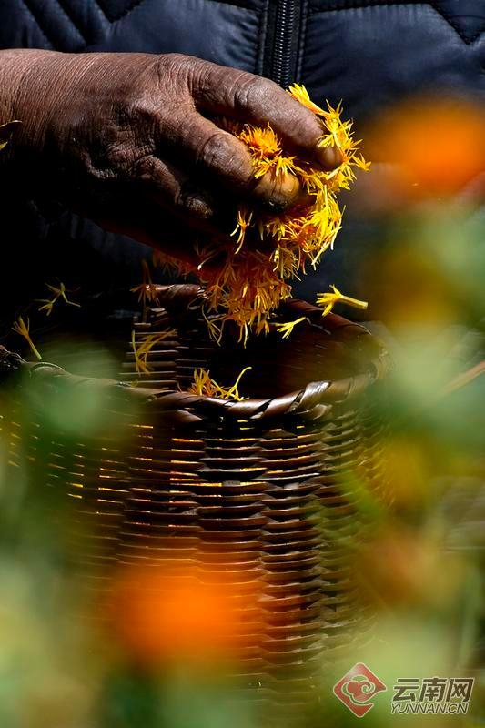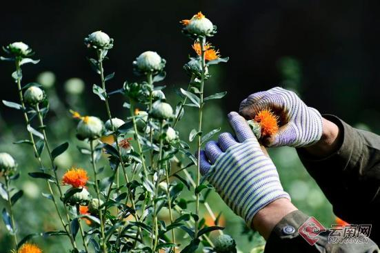 3月29日,大理白族自治州南涧彝族自治县公郎镇村民们正在田间采收红花。连日来,南涧彝乡公郎镇种植的1800亩滇红花迎来丰收,村民忙着采摘、晾晒销售市场。