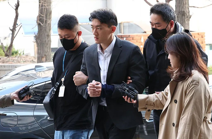 当地时间2023年3月28日,韩国首尔,一直对韩国前总统全斗焕一家发表爆料性言论的孙子全宇元抵达首尔警察厅接受毒品犯罪调查。视觉中国 图