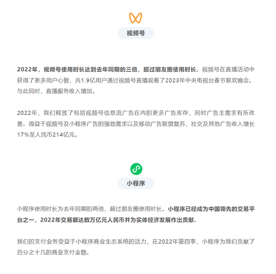 举个例子,2022年,通过搜一搜带动的小程序新增日活用户贡献占比20%,小程序分发量较去年增长26%;视频号新增粉丝量较去年增长120%,视频分发量较去年增长895%。