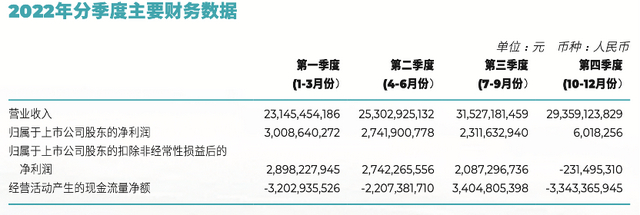 分季度来看,广汽集团2022年四个季度的净利润呈下降趋势,分别为30.09亿元、27.42亿元、23.12亿元、601.83万元。