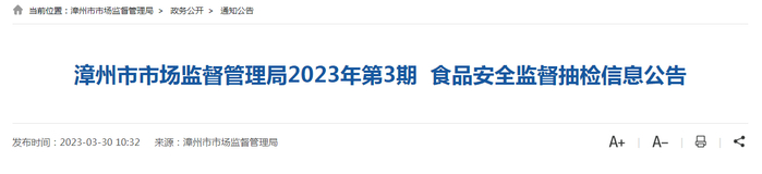 福建省漳州市市场监督管理局发布2023年第3期食品安全监督抽检信息