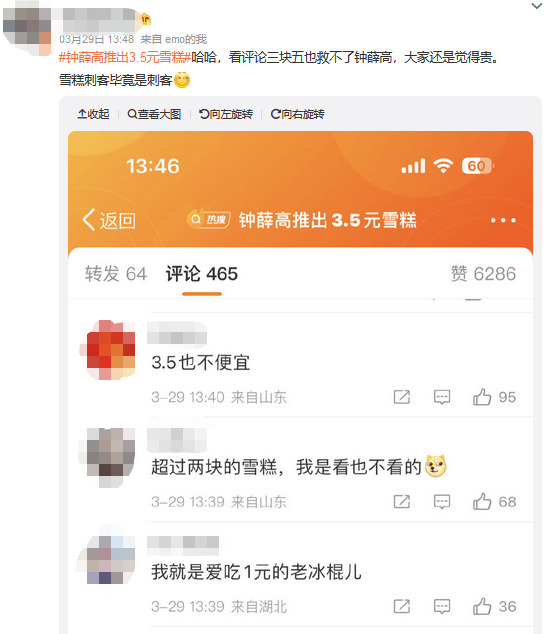 但仍有大多数网友表示,“终于吃得起钟薛高了,但抱歉,我只接受5毛一支的雪糕。”“想转变形象,没必要,反正也不会吃”“降下来干啥,反正穷人又不是你们的目标客户,没必要讨好”。
