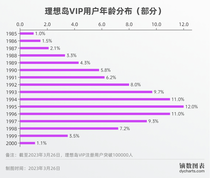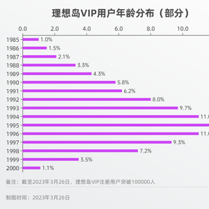 截至2023年3月26日,理想岛VIP用户中,2000年出生的用户占比达1.1%,再加上少量2001年、2002年出生的用户,理想岛VIP00后用户已经超过1200人。