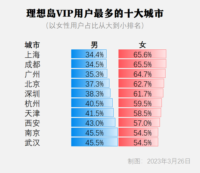 以理想岛VIP用户最多的十大城市为例,上海女性用户最多,占比达65.6%,成都、广州紧随其后,分别为65.%和64.7%。