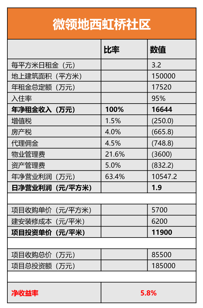 由此算出的结果是,微领地西虹桥社区的毛租金收益率达到8.9%,净收益率达到5.8%。