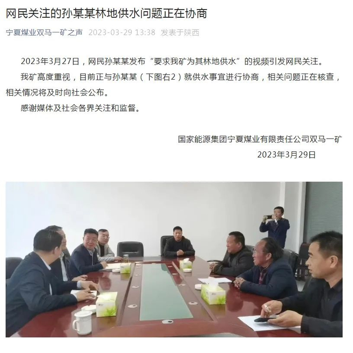 3月29日,涉事煤矿公众号“宁夏煤业双马一矿之声”发布消息称,目前正与孙某某就供水事宜进行协商,相关问题正在核查,相关情况将及时向社会公布。