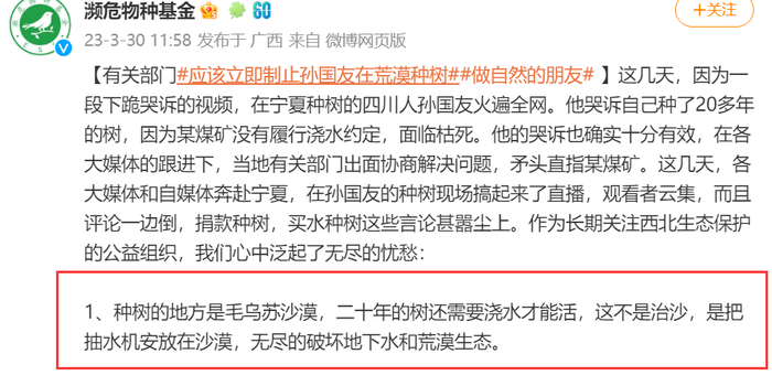 孙国友的视频引发广泛关注后,大量网友对他表示了支持。但是也有一些反对的声音,3月30日,中国生物多样性保护和绿色发展基金会濒危物种基金发微博称,种树的地方是毛乌苏沙漠,二十年的树还需要浇水才能活,这不是治沙。也有网友怀疑孙国友种树并非出于公益目的,可能林场会有经济效益。
