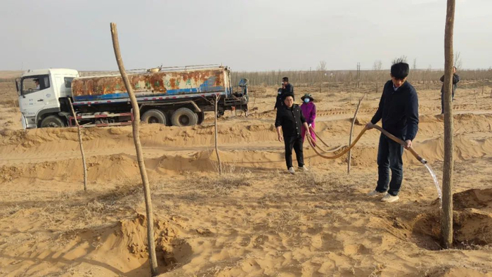 灵武市自然资源局专业技术人员指导苗木保护,马家滩镇工作人员对苗木进行浇灌