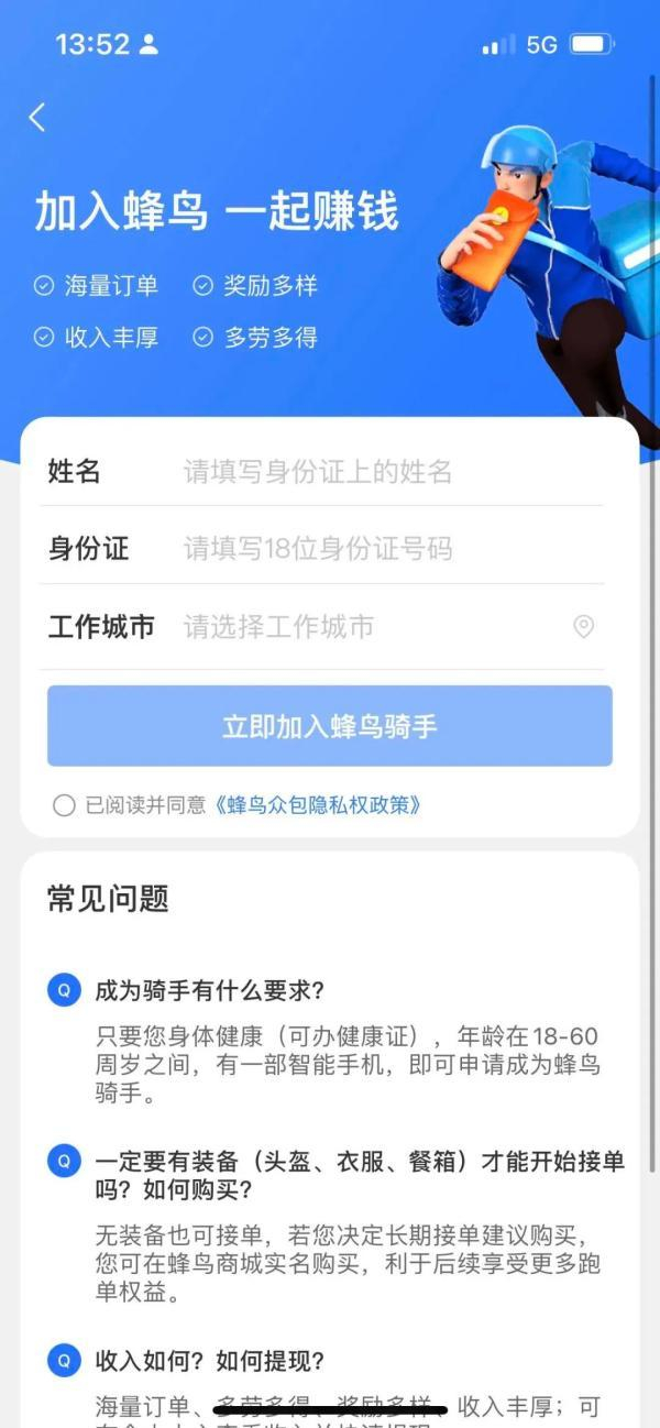 蜂鸟众包骑手年龄上限为60岁
