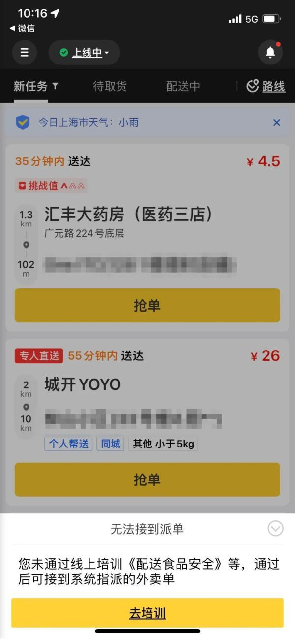 3月30日上午,他再次打开美团众包app,发现已经可以线上培训做题了,页面提示称,通过后可接到系统指派的外卖单。“审核估计今天通过了,所以跳出来做题了,全部题完成就能接单了,我试着做了一套题目,还是比较简单的。”范先生说。