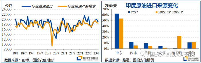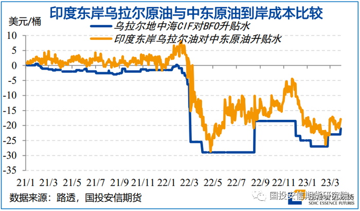 除中国外,印度亦是年内原油需求增长的第二亮点, IEA预估其年内需求增速为3.9%,1-2月印度炼油产品需求及原油进口同比分别增4.1%、6.3%。且由于俄罗斯西部港口乌拉尔原油运送至印度较中国更具距离优势,其较中国对乌拉尔原油的接受度更高。2022年俄罗斯原油完成贸易流转向后,其在印度原油进口中的占比跃升至23%,中东、西非、美国和南美的进口份额被相应挤出至欧洲。但印度舍近求远的主要驱动是受制裁俄罗斯原油的销售折扣,若4月后俄罗斯石油产商相应缩减售价折扣,印度将面临俄罗斯原油与中东原油的再度权衡,因此印度对俄油采购意愿的边际变化将成为俄罗斯原油减产能否兑现的重要观测对象。