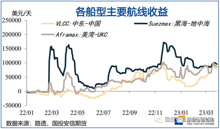 成品油轮方面,俄油制裁后俄罗斯运距拉长带来吨海里增加和运力需求的上升,但因前期欧洲地区库存较高,欧洲成品油采购需求的走弱使其运价在过去一段时间内的上升幅度不及原油。后续随着欧洲库存逐步消耗,采购需求恢复,运距拉长效应对运价的提振作用将逐渐显现。