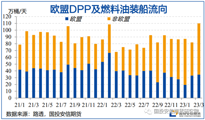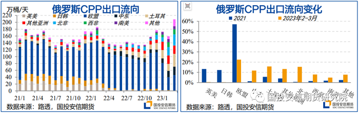 经历了2月5日制裁生效后3周的短暂回落后,截至3月26日俄罗斯CPP产品出口208.9万桶/天创2021年以来新高。欧盟国家在俄罗斯出口总量中的占比自2021年的57%大幅回落至今年2-3月的22.5%,剩余流量主要经希腊、西班牙等地中海国家进行转运,减量部分被流向北非、中东、土耳其以及新加坡等国的增量所替代。
