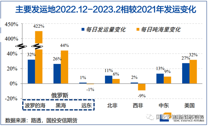 从航线的角度而言,俄乌冲突以来,贸易流向的改变使得全球油轮运距和吨海里规模显著增加,全球原油在途运输规模亦接近2020年疫情时高位。我们对比了制裁开始以来和2021年全球主要原油发运地区的日度发运量,可以看到原油贸易流向的改变对各个航线的吨海里规模造成了不同的影响。