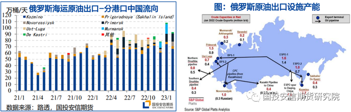 4月乌拉尔原油出口计税折扣缩减后市场的承接能力主要取决于中国和印度。尽管中国对俄罗斯原油的合意接受价格偏高,且国内疫情防控放开后市场对其增量采购需求充满期待,但去年贸易流转向后中国自俄罗斯远东港口Kozmino的进口量已基本达到该港口的原油吞吐上限70万桶/天,边际增量主要通过波罗的海港口Primorsk、Ust-Luga甚至北冰洋Murmansk港口出口穿行苏伊士运河或绕道好望角来实现,运距拉长后运输成本的增加将限制中国对俄罗斯西部港口乌拉尔原油低折扣资源的接货能力。