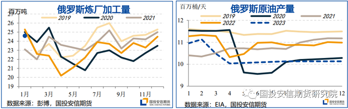 从3月俄罗斯旺盛的成品油出口中不难发现其炼厂加工量仍在高水平运转,彭博数据显示3月前半月俄罗斯炼厂加工量564万桶/天仅较2月微降1.2%,但接下来的炼厂春检有望大幅减弱俄罗斯成品油的出口压力。俄罗斯炼厂每年开展春秋两季检修,其中春检力度更大。从往年的检修影响加工量水平来看,2019年4-6月平均加工量较1月高点下降57.8万桶/天,2020年疫情首年及2022年俄乌冲突导致的加工减量甚至分别高达83.5万桶/天、99.6万桶/天。炼厂进料的减量将部分增加4-6月俄罗斯原油的出口压力,但从前期乌拉尔原油超低折扣下印度的进口力度来看,俄罗斯政府不断缩减计税油价折扣的背景下印度对俄油的进口或难大幅超越去年11月120万桶/天的高峰以进一步挤出中东资源,炼厂加工量的回落大概率仍将反馈至上游油田减产。