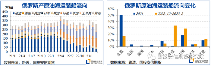 俄罗斯海运原油出口的转向从去年3月战争暴发之初便已经开始,原本流向欧盟及英美日韩等西方国家的贸易流更多的转向了印度、中国、土耳其等政治友好国家。从欧盟禁运正式生效后至今年2月的贸易流转向结果来看,欧盟在俄罗斯海运原油出口中的占比已自2021年的51%回落至17%,剩余贸易流主要流向2024年底前的制裁豁免国保加利亚,或经荷兰、希腊等国进行转运,最终目的地亦以亚太国家为主。印度在俄罗斯海运原油出口目的地中实现了从无到有的变化,近3个月占比已达33.5%,中国流向占比亦自2021年的18.2%提升至28.8%。受出口转向相对顺畅的影响,2022年俄罗斯海运原油装船量增加27.1万桶/天(8.9%)至333万桶/天,12月制裁生效后仅当月发货量短暂降至285万桶/天低位,但1-2月又回升至343.4万桶/天,以应对中国疫情防控放开后亚洲的增量需求。