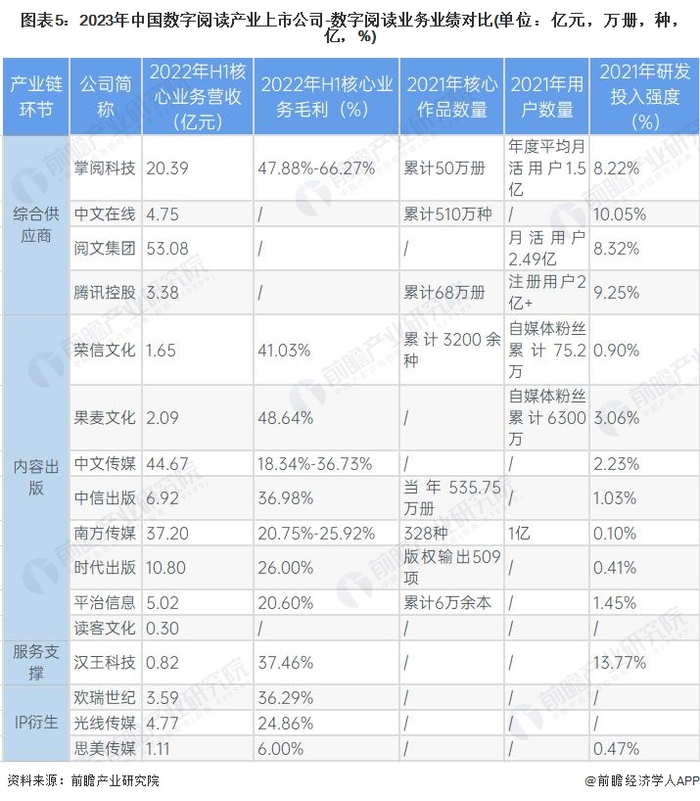 有关数字阅读业务的业绩情况,2022年上半年,综合供应商阅文集团(00772.HK)的核心业务营收最高,超50亿元;掌阅科技(603533.SH)的毛利水平较高,超过60%。