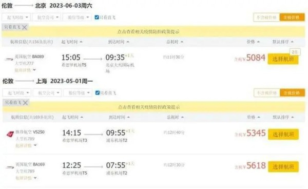 据报道,去年8月中英复航初期,航司官方经济舱票价最低都要两三万,如今都稳定在万元以下了,“三四千就能买到。”