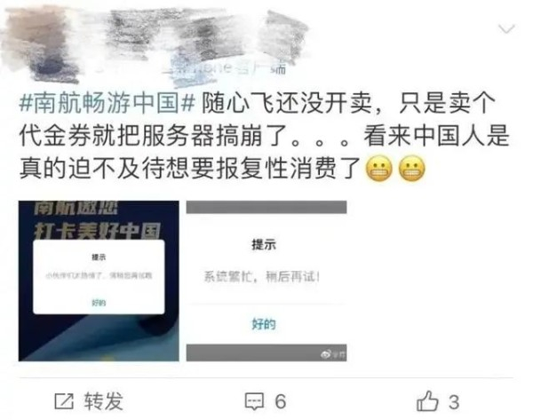 原来,3月29日15时,南航2023版随心飞产品“畅游中国”开放机票兑换,不少网友在社交媒体平台上反映南航App服务器被挤爆。