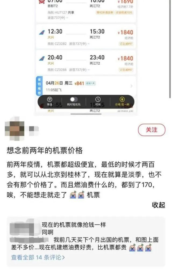 但是,近期不少网友吐槽“杭州飞三亚,一个人来回光机票居然要4800,不知道的以为我去了马尔代夫”、“2月底温州去成都才200多,现在600起步还不包括行李托运。”、“今天都3月27号了,上海回沈阳的机票怎么还没打折”……许多网友纷纷感叹:低价机票的“好”日子已经一去不复返。