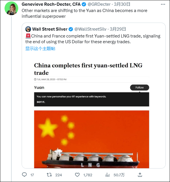 3月30日,推特账号介绍为前资金经济、为彭博社等媒体供稿的财经类撰稿人吉纳维芙·罗克-迪克特(Genevieve Roch-Decter)发布一系列推文称:“美元正在失去其储备货币的地位,这是你应该知道的。”随后,她继续发文介绍相关信息。